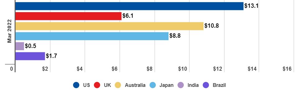 For example, in March 2022, the eCPM rate (revenue per 1000 impressions) for Rewarded Video ads on Android ranged between $13.10 in the US to as little as 50 cents in India.