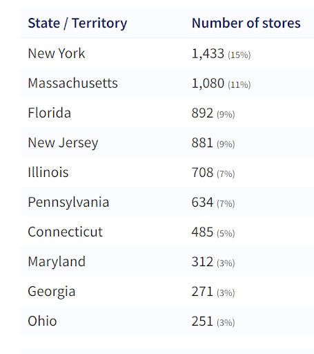 In the US, the state of New York has the highest number of stores, followed by Massachuets, Florida and New Jersey.