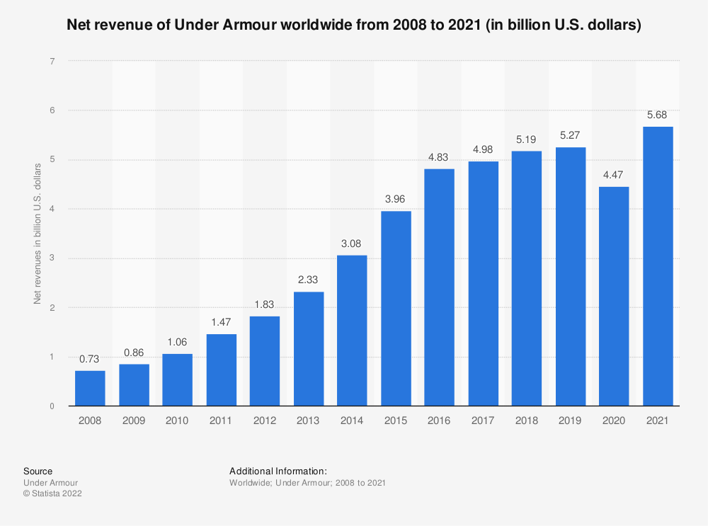 The global sportswear market is incredibly competitive and lucrative. Therefore, the brand takes an aggressive approach to marketing and advertising. In the US, Under Armour invested close to $650 million in marketing spend in 2021, 18% more than the previous year.