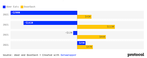 When it comes to Uber Eats vs DoorDash, Uber Eats gets more delivery orders in raw numbers, however DoorDash demonstrates better financial performance. While DoorDash was profitable throughout 2021, Uber Eats showed a profit just in Q4.