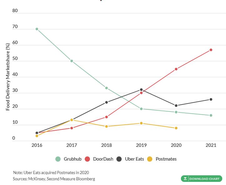 In the years since, DoorDash has rapidly overtaken Grubhub and all other competitors in market share, in particular curbing its closest recent competitor, UberEats.