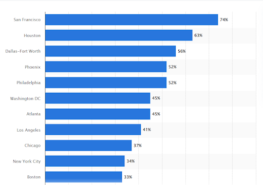 The global pandemic led to a massive rise in the use of food delivery apps, but some geos are more popular than others. In April 2021, San Francisco was the most popular city for DoorDash in the US, with 74% market share, followed by Houston with 63%.