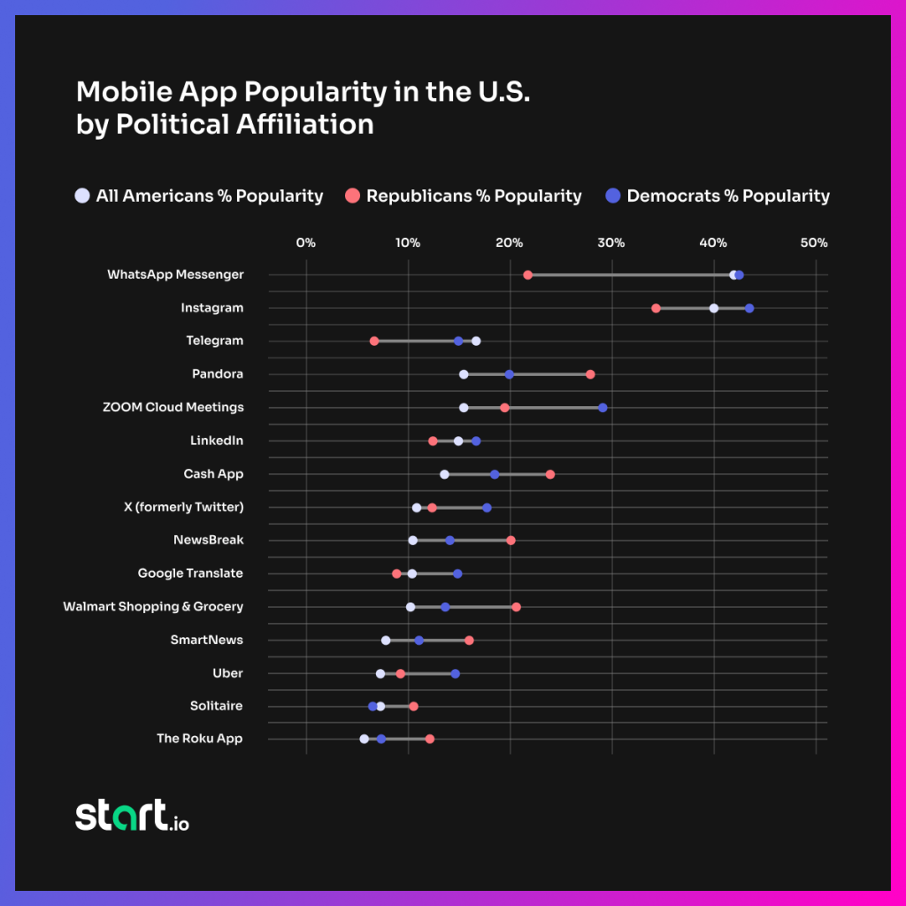 Democrats are more likely to use Instagram, WhatsApp and Zoom, while Republicans prefer Pandora and the Walmart app, according to new data from Start.io.